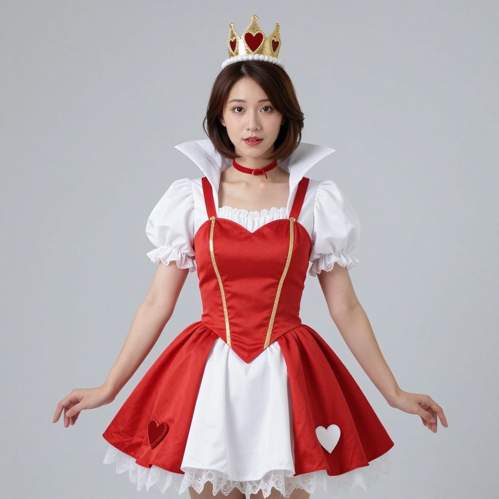Photograph of an Asian woman in a red and white Alice in Wonderland-style dress, wearing a gold crown with heart motifs, against a plain gray background