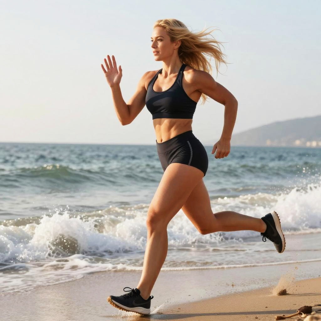 Photograph of an adult athletic petite red-haired woman, at a windy sandy spit under overcast sky, waves crashing behind, sea spray backlit, wet hair detail, dramatic golden glow on skin, reflective wet sand, medium contrast, shallow depth of field, crisp water texture, confident expression, balanced composition, subtle film grain, natural pores, coastal atmosphere, sport editorial with cool muted tones.