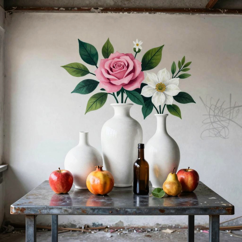 Graffiti wall mural style, gritty metal table in an abandoned warehouse studio, still-life featuring three white vases of varied shapes and a small brown bottle with a dark top; pink roses and white flowers with lively green leaves; fruits arranged around them: a red apple, a yellow-orange pomegranate, another red apple, and a small brown pear with a green leaf; harsh artificial white spotlight; realistic textures, crisp edges, gentle reflections, soft falloff, color-true, editorial quality