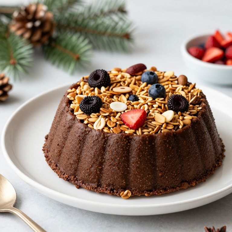 A photograph of a rich, dark chocolate cake with a textured, granulated surface, topped with a mix of sliced almonds, blackberries, blueberries, and a small piece of strawberry. The cake sits on a white plate, positioned slightly to the right on a light gray surface. In the background, there's a blurred pine branch with pinecones and a white bowl filled with more berries. A silver spoon is partially visible on the left. The image is brightly lit with natural light, highlighting the cake's rich texture and colorful toppings.