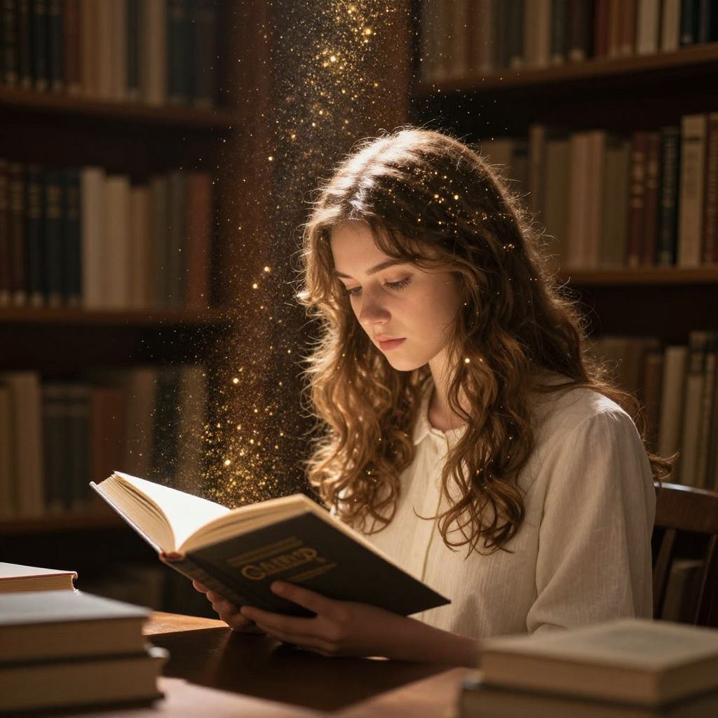 In a cozy library setting, a young woman engrossed in reading an open book is surrounded by a mesmerizing cascade of golden stardust, evoking a magical and ethereal atmosphere reminiscent of fantasy art, where the interplay of light and shadow creates a dreamlike, high-definition visual effect.