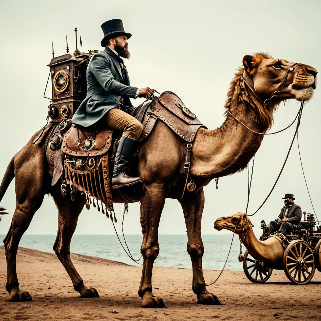 A bearded man dressed in a Victorian-era steampunk outfit, including a top hat, teal coat, beige pants, and black boots, rides a camel outfitted with intricate bronze and leather steampunk-style harness. The camel features a lion's head bridle. In the background, another man operates a similarly styled camel cart on a sandy beach near a calm sea under an overcast sky.