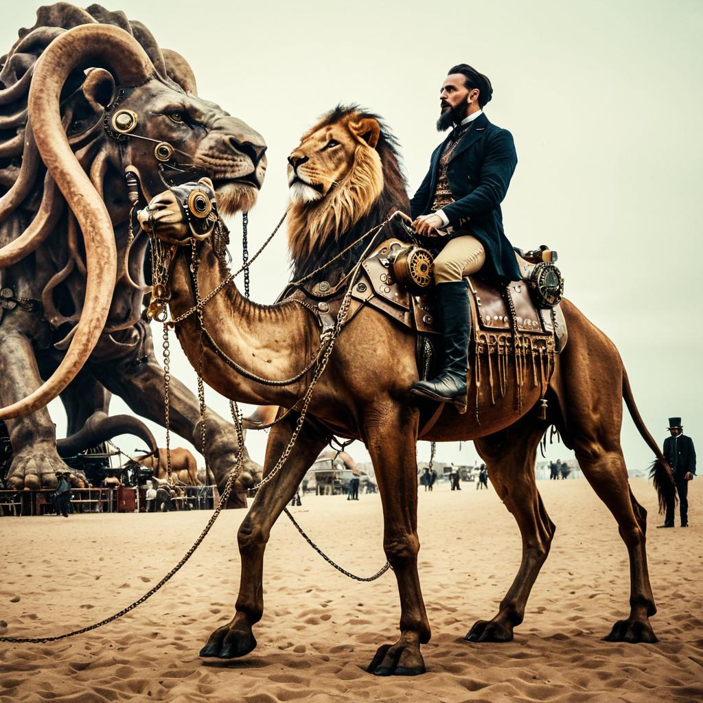 Steampunk Man Riding Camel with Lion Harness