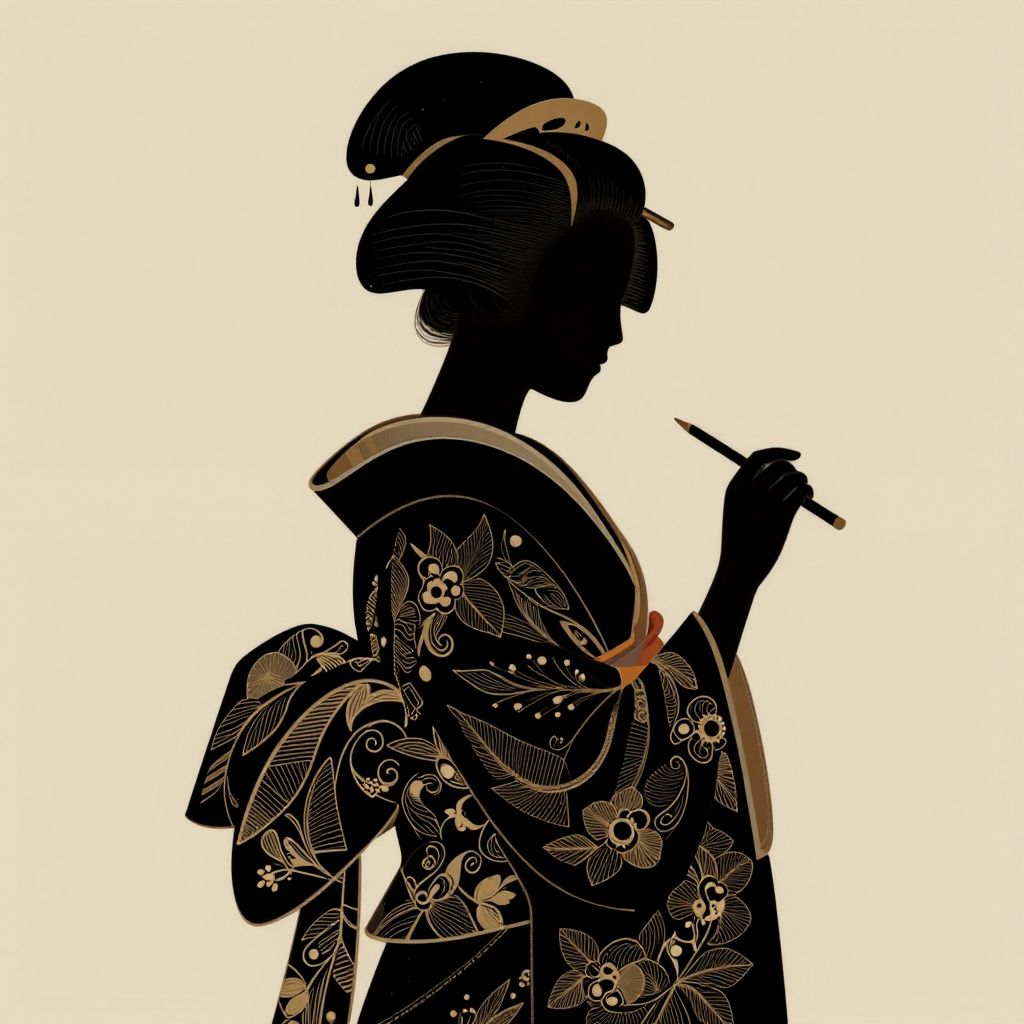 This digital silhouette illustration depicts a Japanese woman in profile, shown from the waist up. She is wearing a traditional kimono adorned with intricate floral patterns in gold and beige against a black background. Her hair is styled in an elegant updo with a hairpin. She holds a narrow pipe in her right hand, which is raised to her mouth. The background is a solid, pale cream color, making the black silhouette and gold details of the kimono stand out prominently. The overall style is minimalist yet detailed, focusing on the elegance and cultural significance of the traditional Japanese attire.