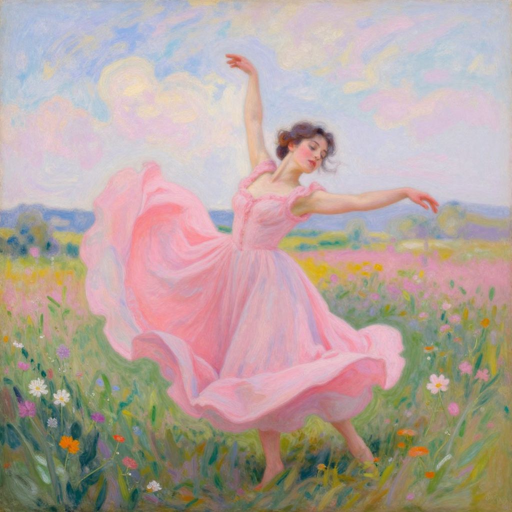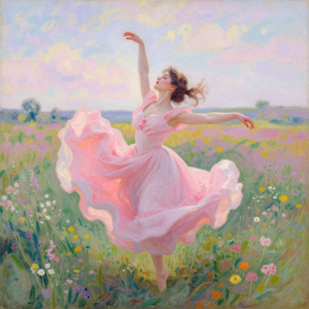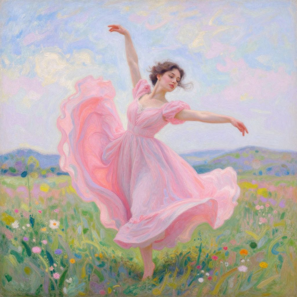 Woman dancing gracefully in a flowing pink dress amidst a vibrant meadow under a serene sky, embodying the essence of Willem Haenraets' impressionistic style.