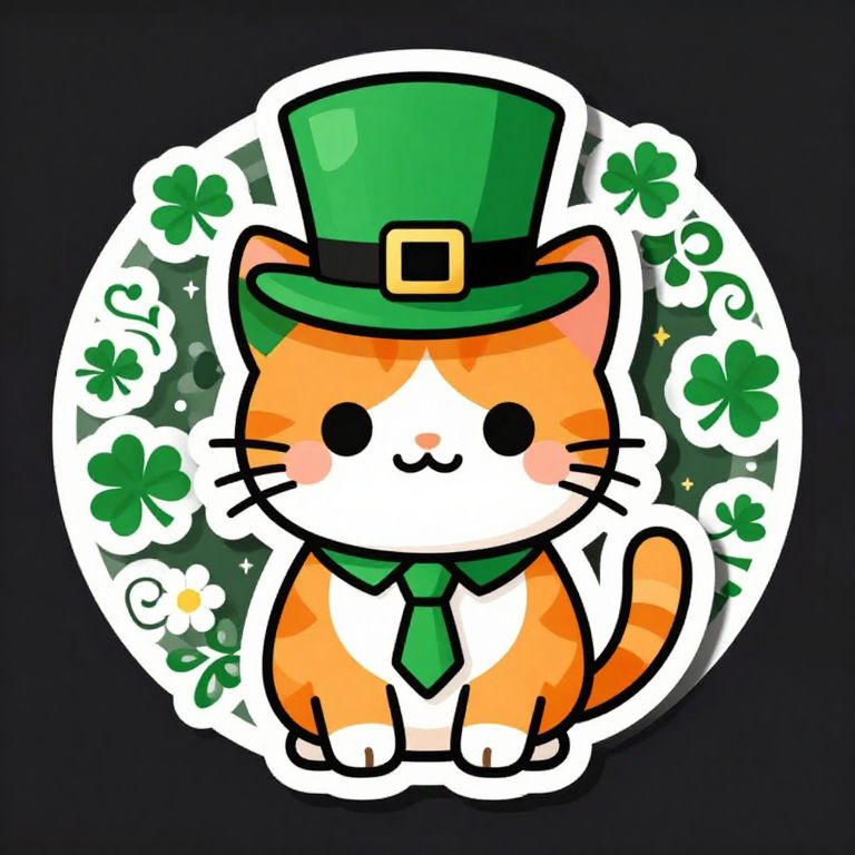 A digital illustration of a cute, chibi-style orange and white cat wearing a green top hat with a black band and gold buckle, and a matching green necktie. The cat has large, black, circular eyes and a small, smiling mouth. Surrounding the cat is a circular white background adorned with green shamrocks and small yellow stars. The overall style is playful and cartoonish, with bold lines and bright colors, set against a solid black background. The cat's tail is curled to the right.