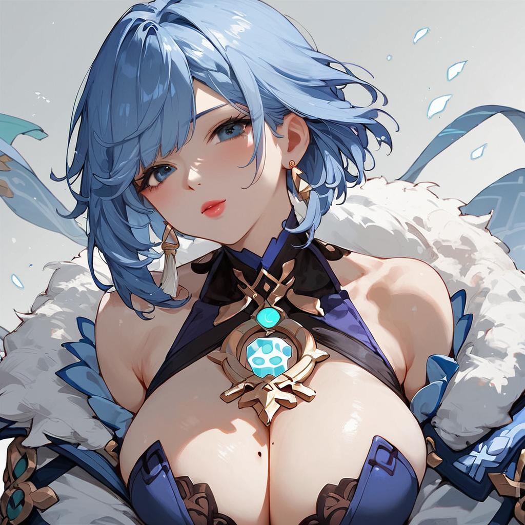 Score_9, score_8_up, score_7_up, source_anime 1girl, solo, 1girl, breasts, looking at viewer, short hair, bangs, large breasts, gloves, long sleeves, dress, cleavage, bare shoulders, jewelry, green eyes, blue hair, jacket, cowboy shot, upper body, earrings, mole, fur trim, clothing cutout, blue dress, bob cut, white jacket, tassel, mole on breast, vision (genshin impact), fur-trimmed jacket, dice, diagonal bangs