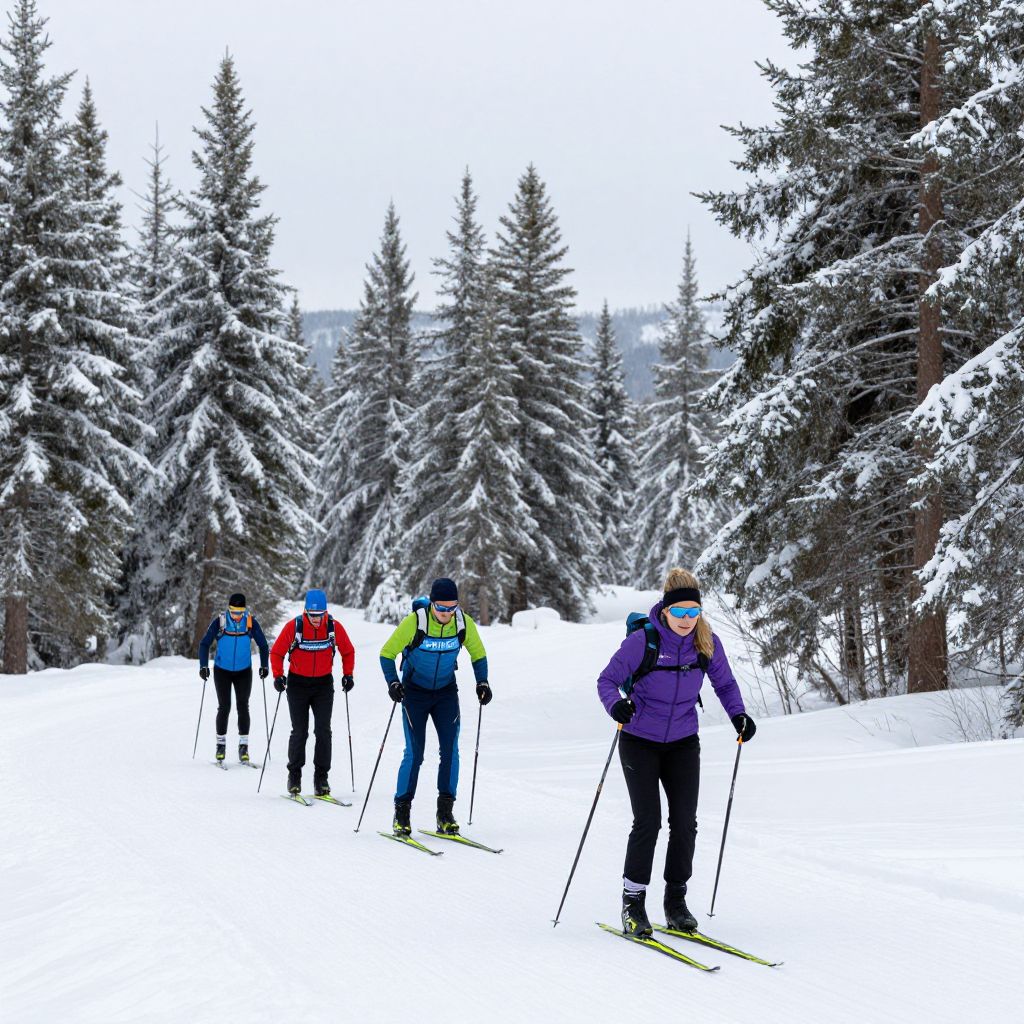 Cross-country skiers navigate a snowy trail lined with snow-covered evergreen trees at Sundance Nordic Center, with four individuals visible in colorful winter attire, including a woman in purple leading the group.