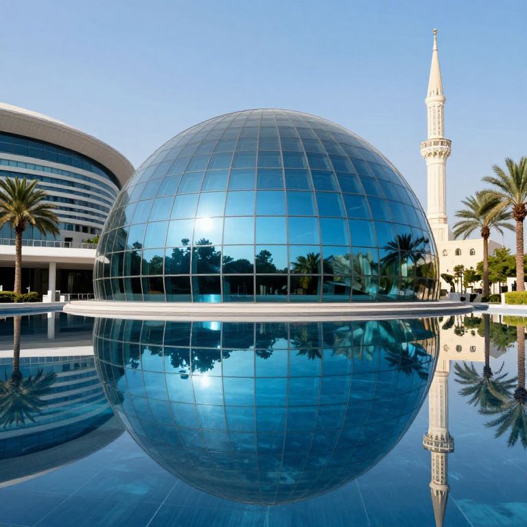 Photograph of a futuristic, dome-shaped building with a glass grid facade reflecting blue skies and surrounding trees. The building is mirrored perfectly in a calm, clear water pool in the foreground. In the background, there's a modern, curved building and a traditional mosque minaret with a pointed spire. Palm trees line the edges of the scene. The image has a vibrant, hyper-realistic style.