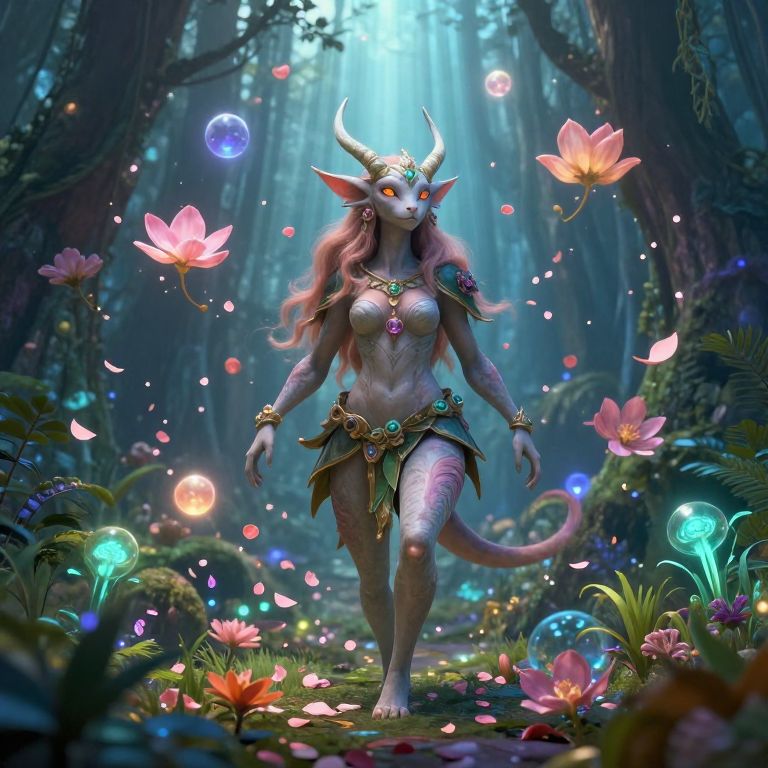 Craft an enchanting digital art piece with a surreal 'bug's-eye view', capturing a serene forest clearing illuminated by soft moonlight. In this scene, a regal creature stands amidst a circle of luminescent mushrooms, their vibrant colors contrasting the cool blue and purple tones of the night sky. The creature's shimmering coat reflects the stars above, while its eyes hold an air of ancient wisdom and mystery. This tranquil yet awe-inspiring atmosphere invites viewers to explore the ethereal beauty hidden within this magical realm as it transitions seamlessly between celestial heavens and mystical forest floor.