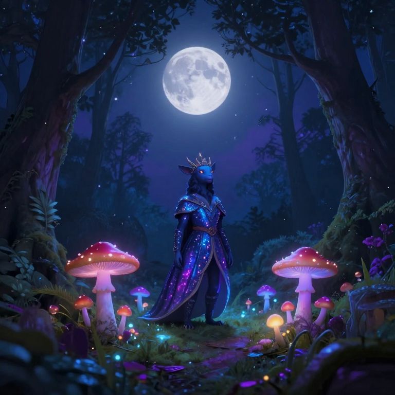 Digital artwork of a mystical forest at night, illuminated by a bright full moon. A glowing, ethereal figure with a shimmering, multi-colored cloak and crown stands center, facing the moon. Surrounding the figure are vibrant, bioluminescent mushrooms in red, blue, and orange hues, casting a soft glow. The forest is dense with dark, shadowy trees and twinkling stars in the background. The scene exudes a magical, otherworldly atmosphere with a mix of dark blues and vibrant colors.