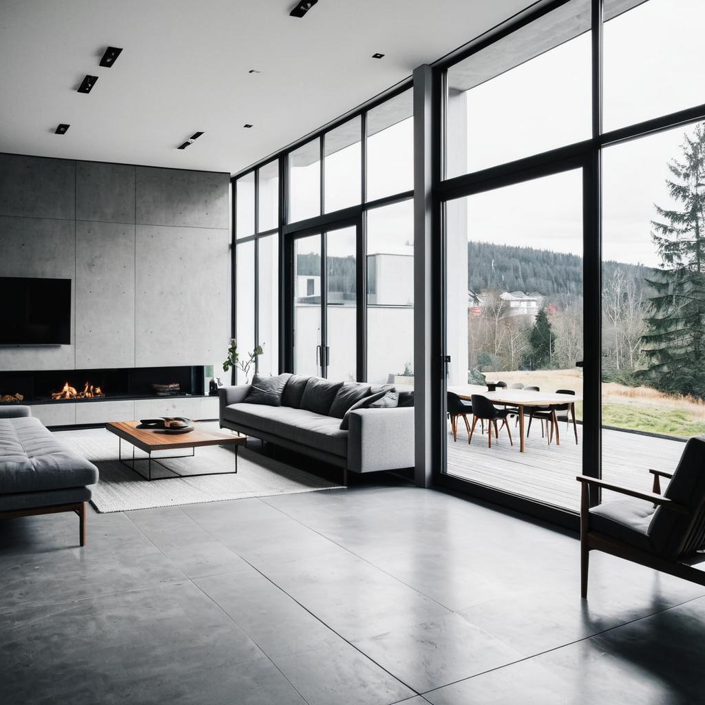 Doodle mountain retreat in Newcastle, Washington, a rustic mountain modern masterpiece with a dark stained wood exterior and floor-to-ceiling windows. The interior features an open-concept design with kenyan wool rugs and stone accent walls and high-end appliances. The living room has a large stone fireplace and wrought iron chandelier and a statement antler sculpture. The bedrooms are spacious with cool grays and forest greens. The backyard has a stone patio with a fire pit and a swimming pool. The house has a chic and sophisticated vibe. The environment is secluded forest setting surrounded by pine trees, surrounded by other high-end homes and manicured lawns. The atmosphere is elegant and refined, with a touch of glamour. Style: Nature details photography with a wide-angle lens. The photograph will showcase the clean lines and angles of the house. The wide-angle lens will capture the scale and grandeur of the property.