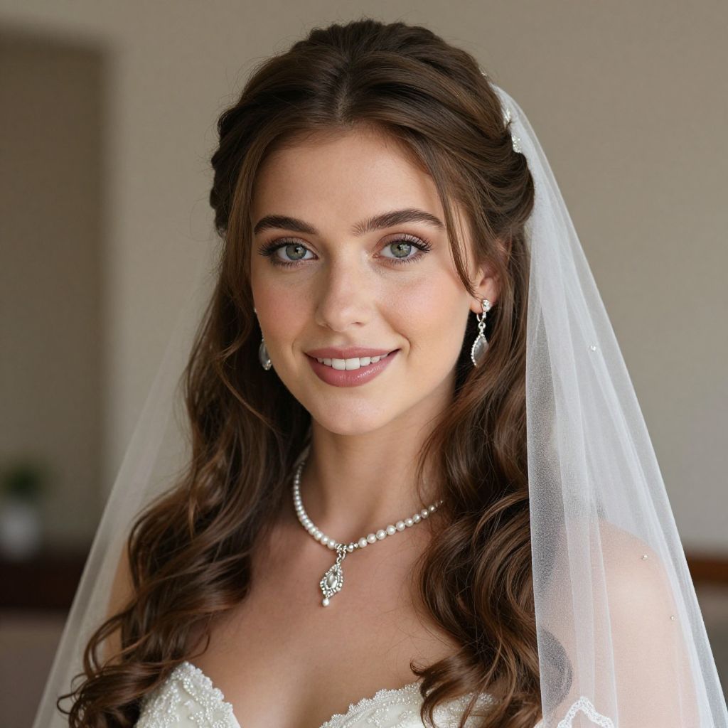 Photograph of a young Caucasian woman with fair skin and long, wavy brown hair, wearing a white bridal veil and an elegant white lace wedding dress. She has blue eyes, well-groomed eyebrows, and is smiling softly. She is adorned with pearl earrings, a matching pearl necklace, and a small, dangling pendant. The background is blurred, featuring neutral-colored walls and a faintly visible potted plant. The image has a soft, natural light, highlighting her features and creating a gentle, romantic atmosphere.
