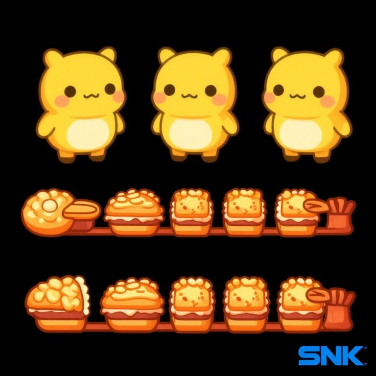 "Kawaii Food A three-headed character sprite sheet to be used for belt scrolling. Metal Slug style released by SNK.,"