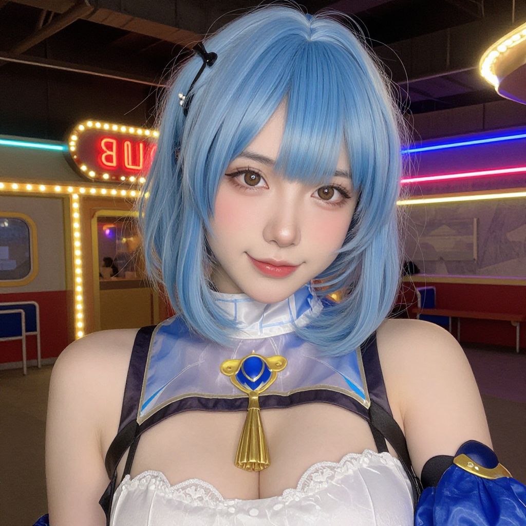 A close-up realistic photograph of a woman with short blue wig, wearing a detailed coraline costume, showing her soft facial features with warm brown eyes and a gentle smile, set in a dimly lit underground carnival with flickering neon signs and retro decor. The woman has big tits and cute face