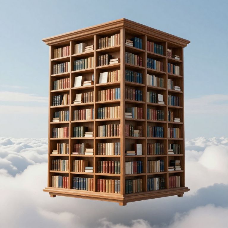 Photorealistic digital illustration of a tall, wooden bookshelf floating in a clear blue sky with scattered white clouds. The bookshelf has a square base and top, with a total of 12 rows and 12 columns of shelves, containing a mix of hardcover and paperback books in various colors. Some shelves are neatly arranged, while others have books stacked haphazardly. The wood grain is visible, giving the shelf a natural, warm texture. The sky and clouds form a serene, ethereal background, emphasizing the bookshelf's floating appearance.