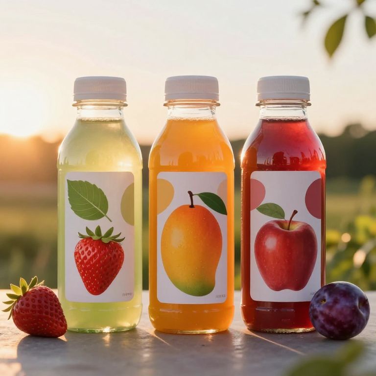 The image features three juice bottles arranged in a row, each with a minimalist design and vibrant, realistic fruit images on the labels. The bottle on the left displays a green leaf and a red strawberry, the middle bottle showcases an orange and a yellow mango, and the bottle on the right presents a red apple and a purple plum. The labels are adorned with abstract, colorful patterns that complement the fruit images, creating a visually appealing contrast. The sunlight, emanating from the left side of the image, casts a warm glow over the scene, enhancing the natural and fresh appearance of the fruits. The bottles are positioned on a flat surface, with the background depicting a serene landscape at sunset, adding a sense of tranquility to the overall composition. The brand name is subtly integrated into the design, ensuring it is noticeable without overshadowing the main visual elements. The entire scene is captured with a high level of detail, making the fruits and labels appear almost hyper-realistic.
