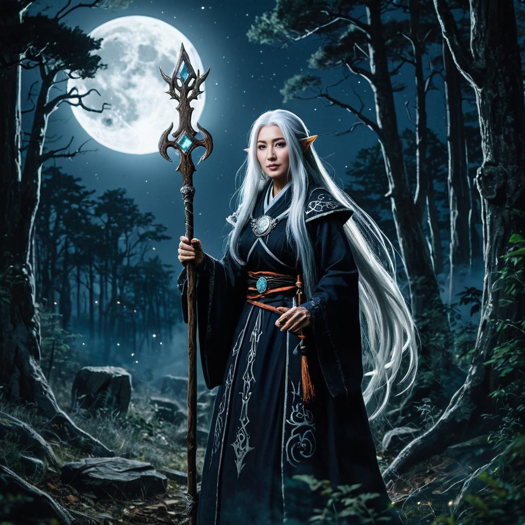 An ageless witch with long silver hair and glowing elf-like ears stands in a moonlit clearing of an ancient forest. She wears a detailed dark robe adorned with intricate glowing sigils and holds a carved wooden staff topped with a blue crystal. The scene is atmospheric, rendered in an emotionally charged anime style, featuring a large full moon illuminating the misty woodland background.