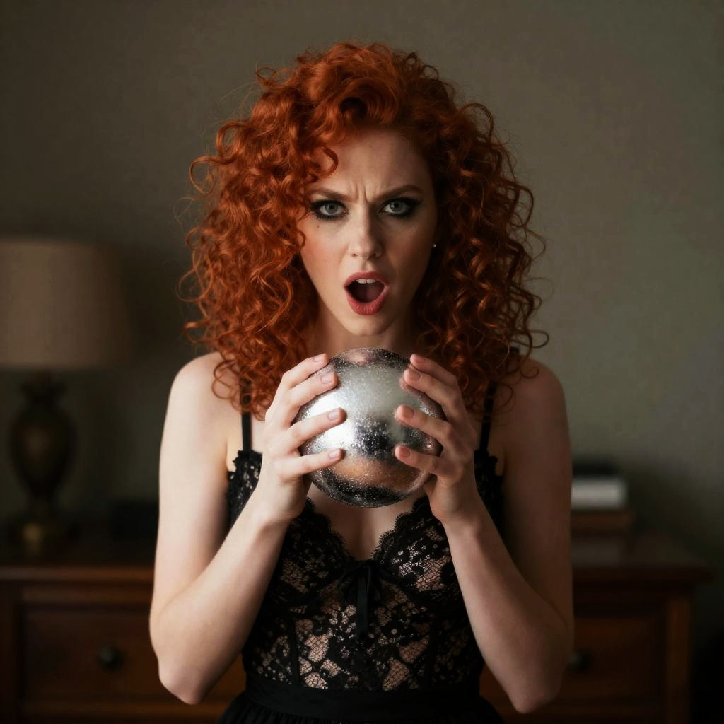 Woman with curly red hair, black eyeliner, and open mouth holding a silver, ured ball. Black lace dress, intense expression. Dimly lit background, wooden furniture partially visible. Upper body shot, centered.