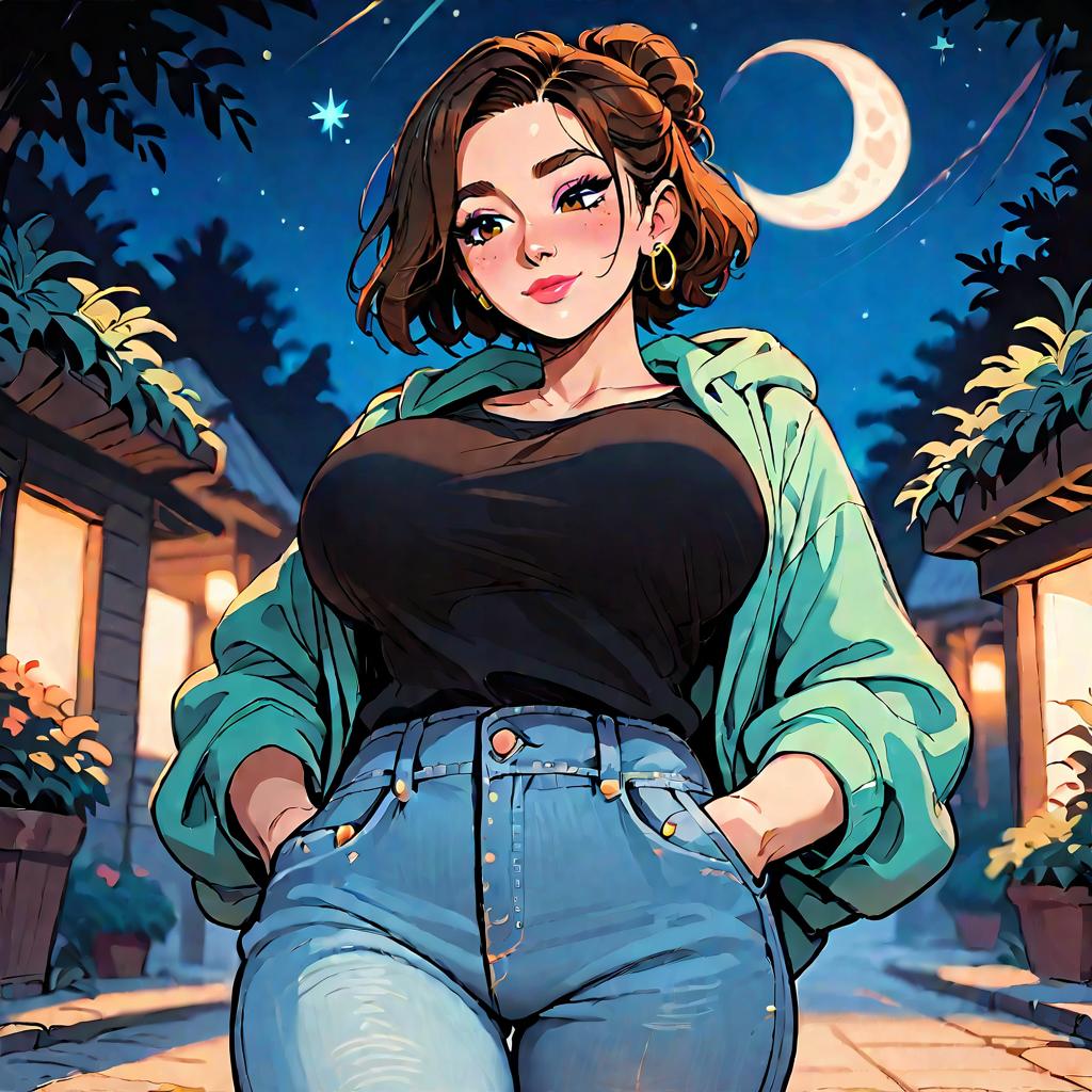 Score_9, score_8_up, score_7_up, source_anime, anime coloring, rating_sensitive, sexually suggestive, blurry background, depth of field, from below, front view, 1girl, solo, tension, mysterious, smile, (leaning back:1.1), hands in pockets, looking ahead, outdoors, simple background, night, moon, starry sky, plant, short hair, brown hair, single hair bun, brown eyes, thick eyebrows, mole under eye, large breasts, (huge breasts:0.8), black shirt, collarbone, green hoodie, jeans, open clothes