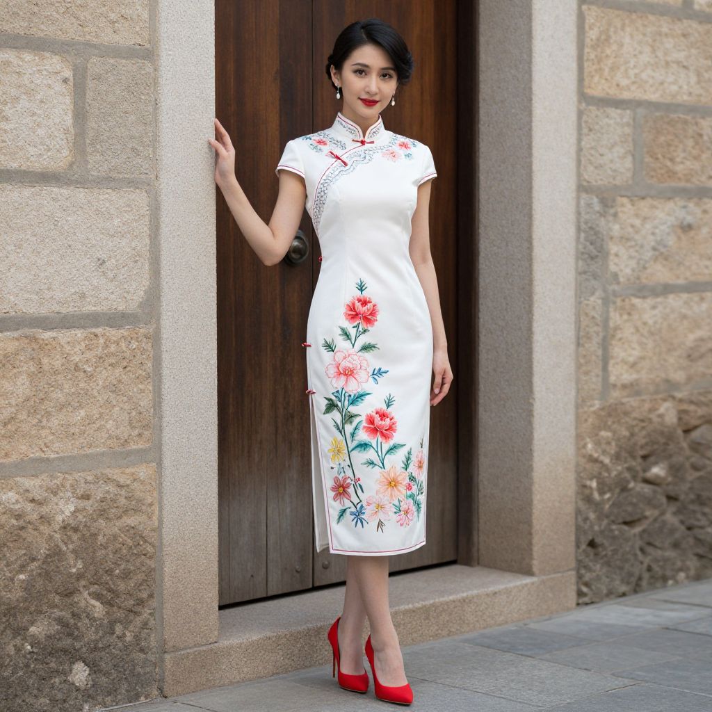 Elegant woman showcasing a stylish white hand-painted retro cheongsam dress with floral embroidery, paired with red high heels, standing gracefully in front of a rustic stone wall and wooden door.