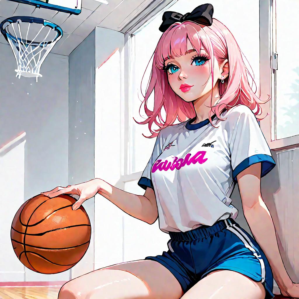 Score_9, score_6_up, source_anime, 1girl, solo, indoors, basketball, chika, blue eyes, pink hair, hair bow, white t-shirt, blue shorts, gym uniform, black bow