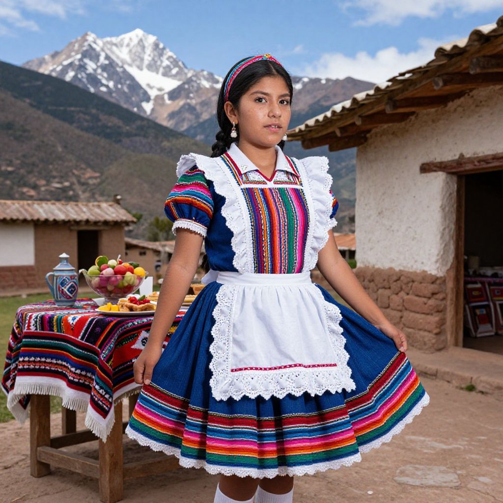 Hyperrealistic art Peruvian Maid (Andean Elegance): A (radiant se├▒orita:1.1) with raven-black hair, expressive dark eyes, olive skin, possessing a spirited figure, clad in a traditional, Andean-inspired (maid dress:1.2) adorned with vibrant textiles, a crisp white apron, occasionally a colorful headband, (stockings:1.1). Immerse in the vibrancy of a Peruvian hacienda, characterized by adobe walls, Incan textiles, a table set with ceviche, overlooking the majestic peaks of the Andes. . Extremely high-resolution details, photographic, realism pushed to extreme, fine texture, incredibly lifelike