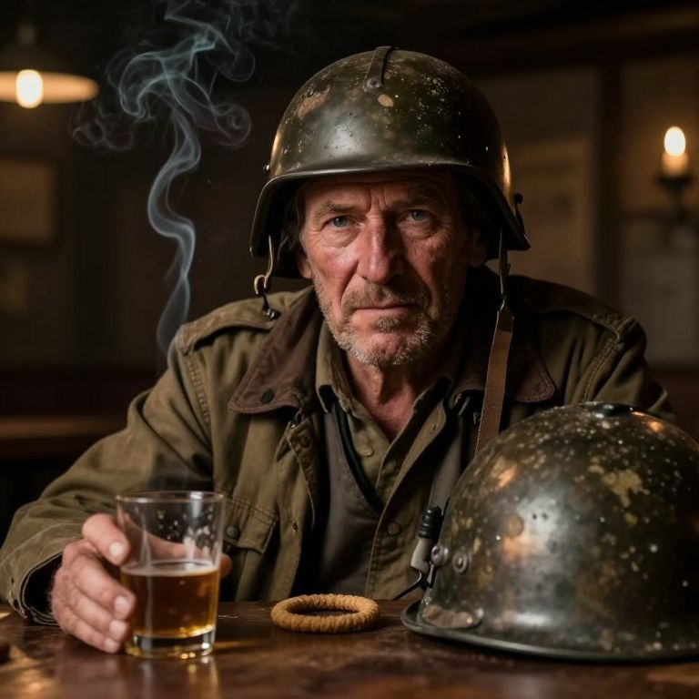 A photograph of a middle-aged, rugged man with a weathered face and graying beard, wearing a worn, metallic World War II-style helmet and olive-green jacket. He sits in a dimly lit, rustic bar, holding a glass of amber liquid with a small blue smoke curling above it. His right hand rests on a second, matching helmet on the wooden bar table. The background is blurred, featuring warm, ambient lighting and wooden textures. His expression is serious, and a coiled bracelet lies next to his hand, adding to the vintage, historical atmosphere of the scene.