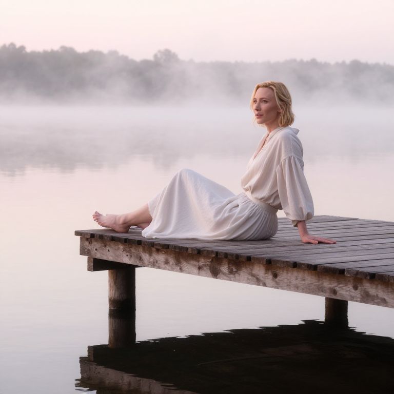 Cate Blanchett barefoot on a rustic wooden dock over a misty lake, calm water reflections, early morning fog, soft pastel colors, relaxed and introspective mood, high detail realism
