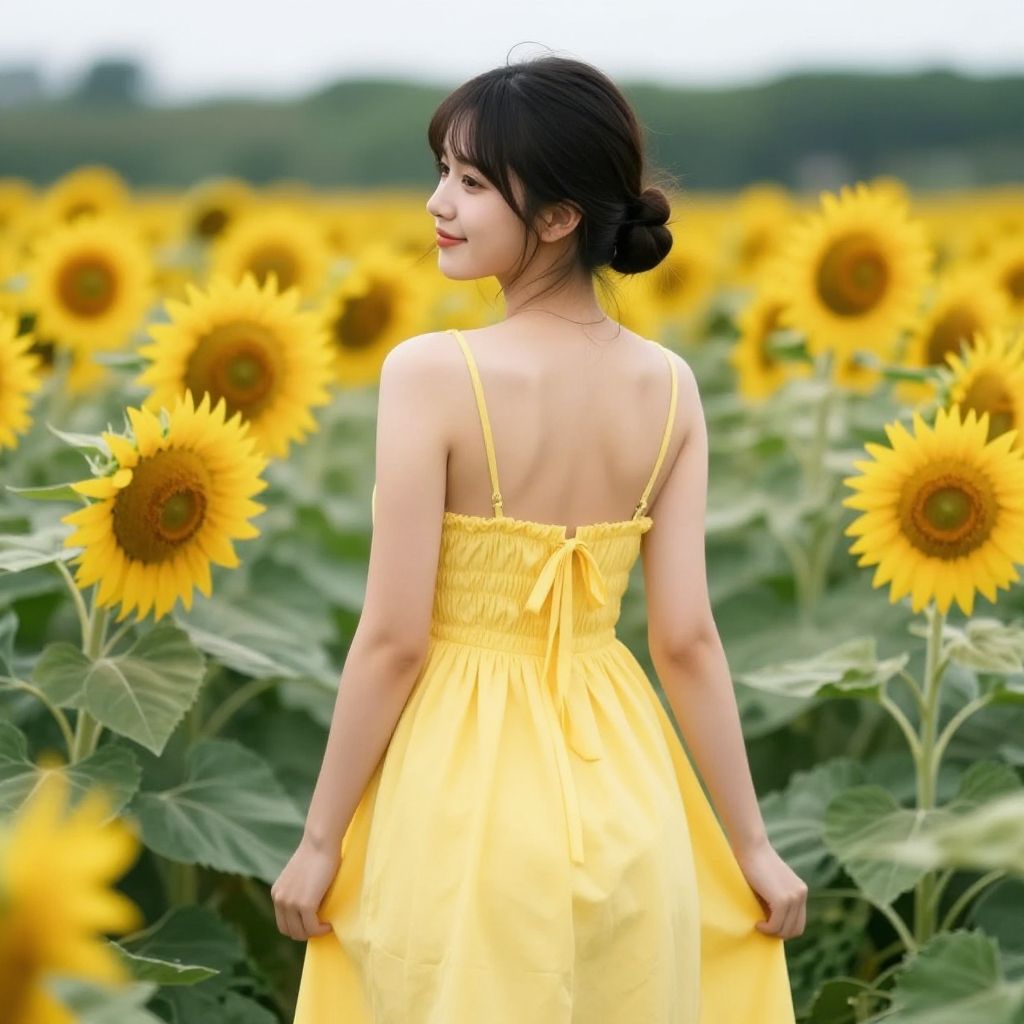 Photograph of an Asian woman with fair skin and black hair in a low bun, standing in a sunflower field. She wears a bright yellow, spaghetti-strap dress that cinches at the waist and flares out. She faces away from the camera, looking over her shoulder with a slight smile. The sunflowers are vibrant yellow with green leaves, filling the background. The sky is overcast, and the field stretches into the distance, creating a serene, summer atmosphere. The woman's dress and the sunflowers complement each other in color, adding a cheerful, natural beauty to the scene.
