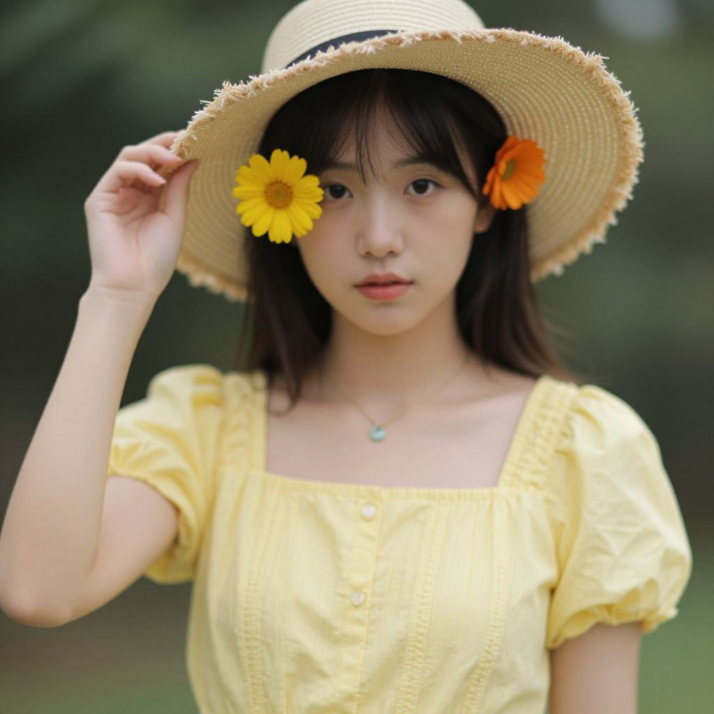 Photograph of an Asian woman with dark hair in a bun, wearing a yellow sundress, standing in a sunflower field, smiling back at the