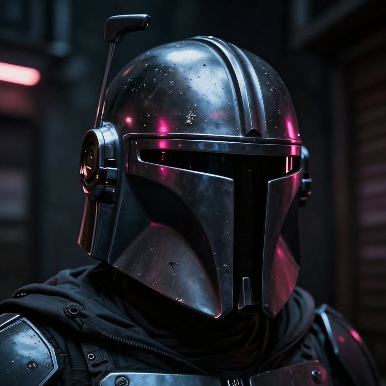 Photograph of a dark, reflective Mandalorian helmet with pink neon highlights, showing detailed armor and a hooded garment in a dimly lit urban setting