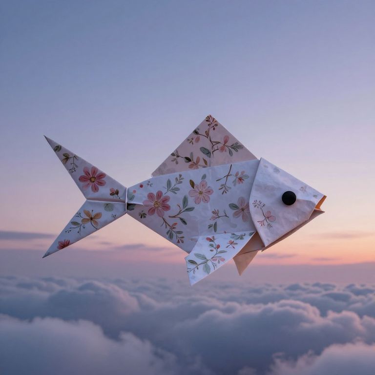 Giant origami fish, adorned with delicate floral patterns, glide effortlessly through a twilight sky, their ethereal forms defying gravity as they soar above a sea of clouds.