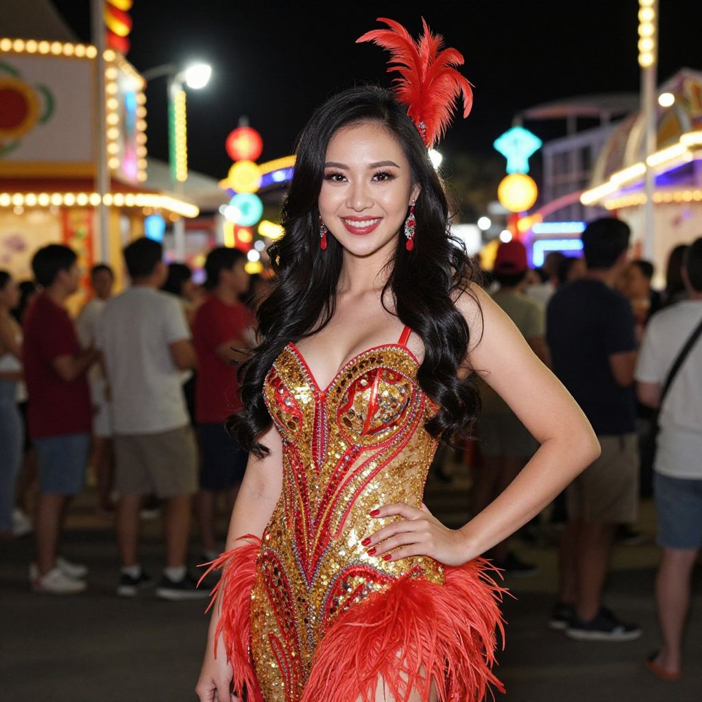 Photograph of a beautiful Asian woman with long, wavy black hair, wearing a dazzling red and gold sequined dress with a feathered skirt and a red feather headpiece. She's smiling confidently on a brightly lit, colorful carnival night. The background shows a lively crowd, neon lights, and festive decorations, creating a vibrant, celebratory atmosphere.