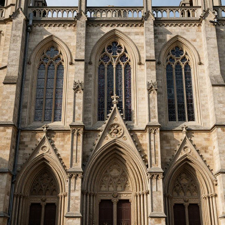 Photograph of a Gothic-style cathedral facade featuring three large, pointed arched windows with intricate tracery and stained glass. The stone facade is light beige, with detailed carvings at the arches' peaks. Below the windows are three smaller pointed arches, each adorned with decorative stone reliefs. The building's texture is rough and weathered, with shadows enhancing the depth of the carvings. Above the windows, a row of smaller, repetitive arches forms a parapet. The sunlight casts sharp shadows, emphasizing the architectural details. The overall style is characteristic of medieval Gothic architecture.