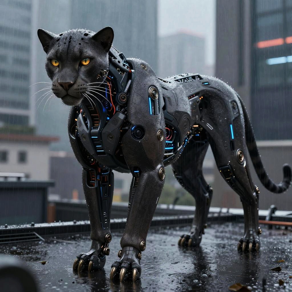 Anime art style a cybernetic panther in a rainy high-tech rooftop