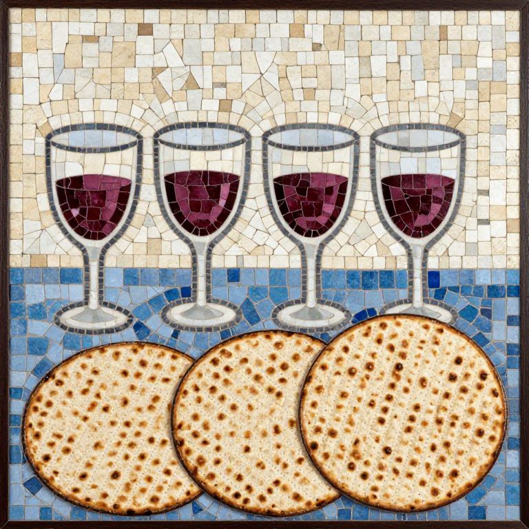 Softening mosaic picture, Haggadah for Passover four cups of wine, and 3 round Matzos, mosaic art, jewish holiday art, mixed media art,