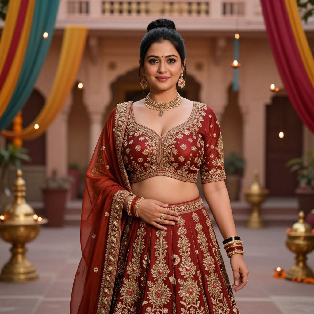 A confident Indian woman in her 30s with fair skin, straight black hair pulled into a bun, and a gentle smile wearing a richly embroidered lehenga choli in cotton silk, standing in a festive haveli courtyard during a Diwali celebration, with golden lamps and colorful fabrics floating in the air around her.. The woman has big tits and cute face