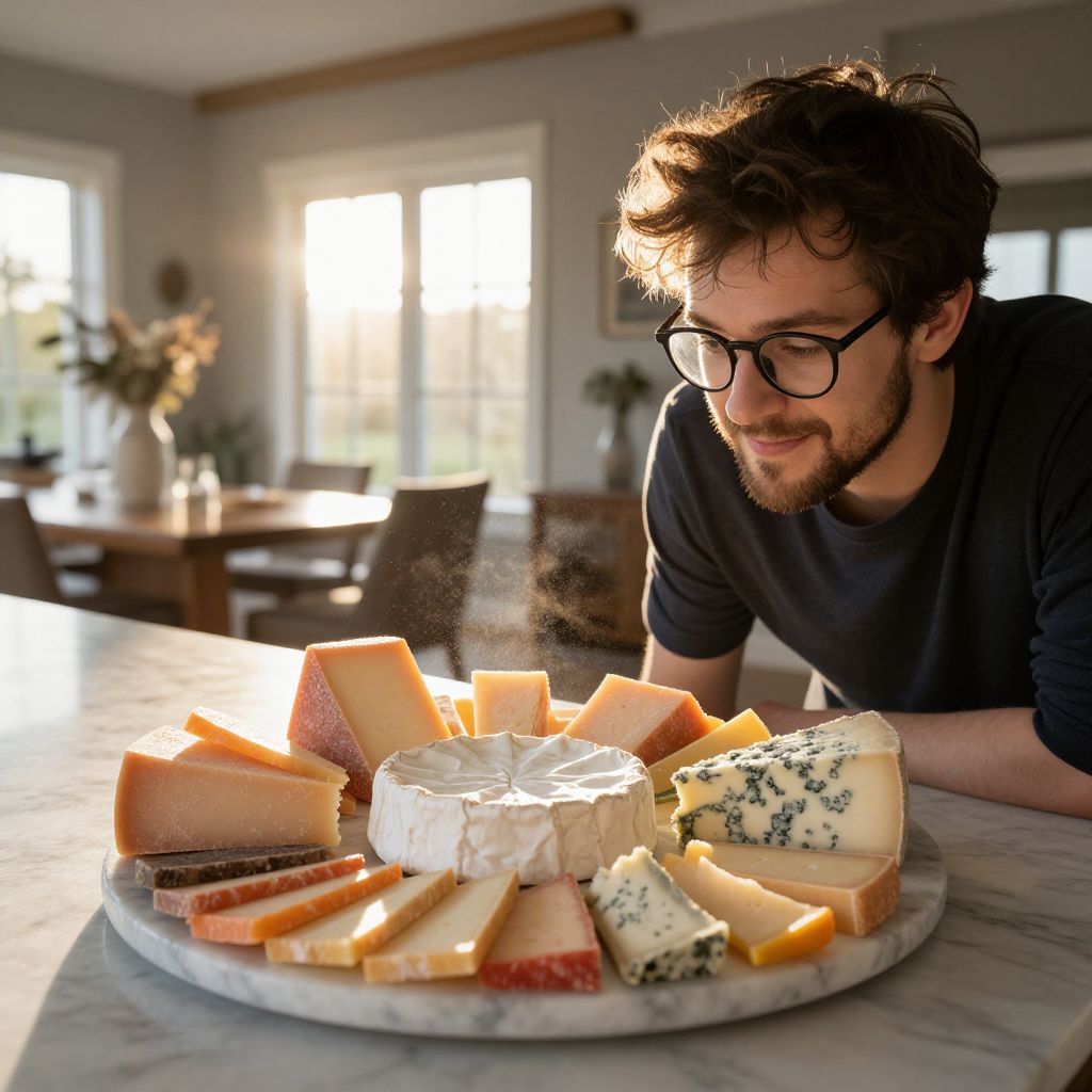 An elegant cheese platter displayed on a marble countertop in a modern countryside dining room, showcasing creamy camembert, aged parmesan, blue cheese, and goat cheese in colorful slices. Soft golden daylight streams through large windows, illuminating dust motes in the air. A young man with glasses and a slightly tousled dark beard leans slightly forward, smiling at the platter with curiosity and satisfaction.