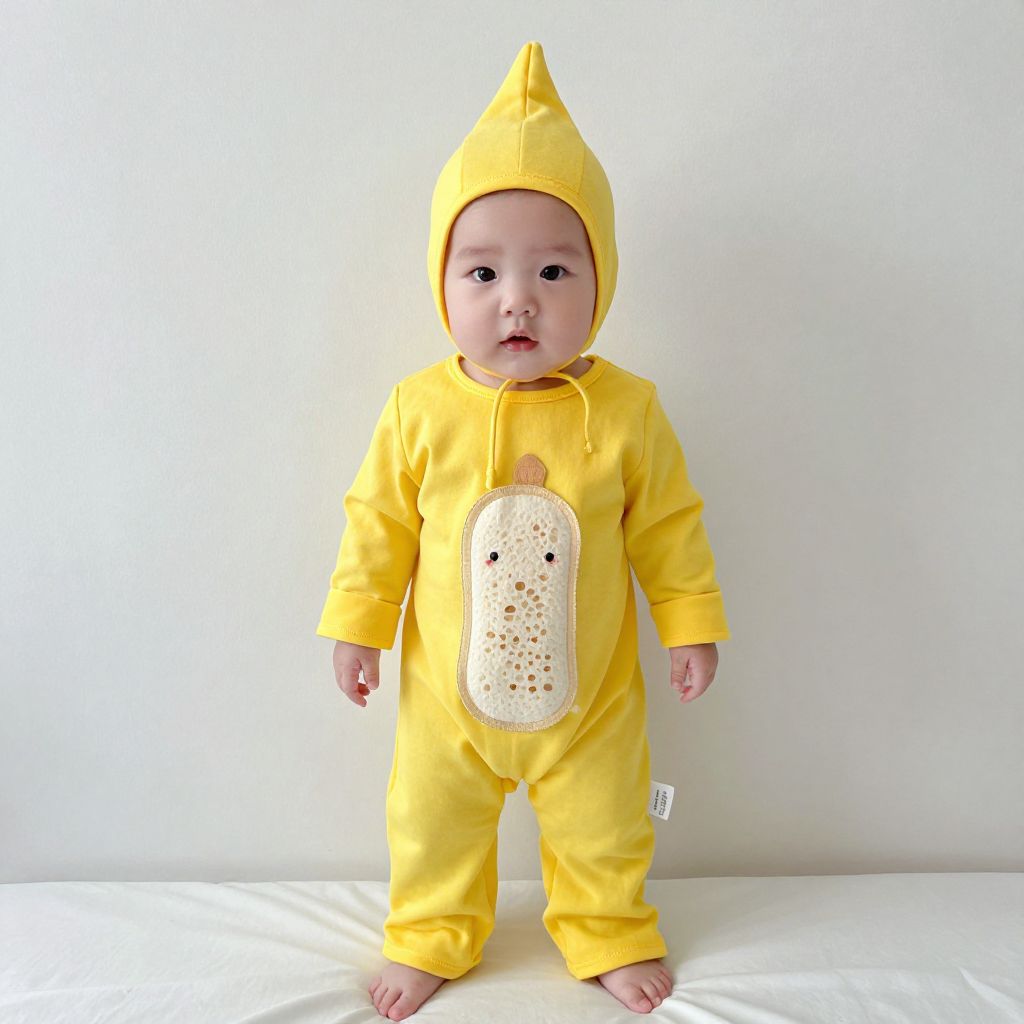 Photograph of a baby in a bright yellow onesie with a corn design, matching yellow hood, standing against a plain white background.