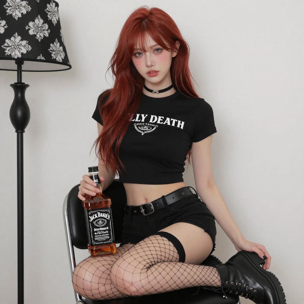 Photograph of a red-haired woman with pale skin, wearing a black "Polly Death" crop top, black shorts, fishnet stockings, and black boots. She sits on a black chair, holding a bottle of Jack Daniel's whiskey. The background includes a black and white floral-patterned lampshade and a white wall.