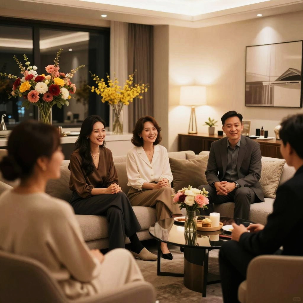 Invited scene in a cozy modern living room with warm lighting, elegant guests dressed in semi-formal attire, vibrant decorations, and a welcoming atmosphere, capturing the essence of a friendly gathering, soft focus background.