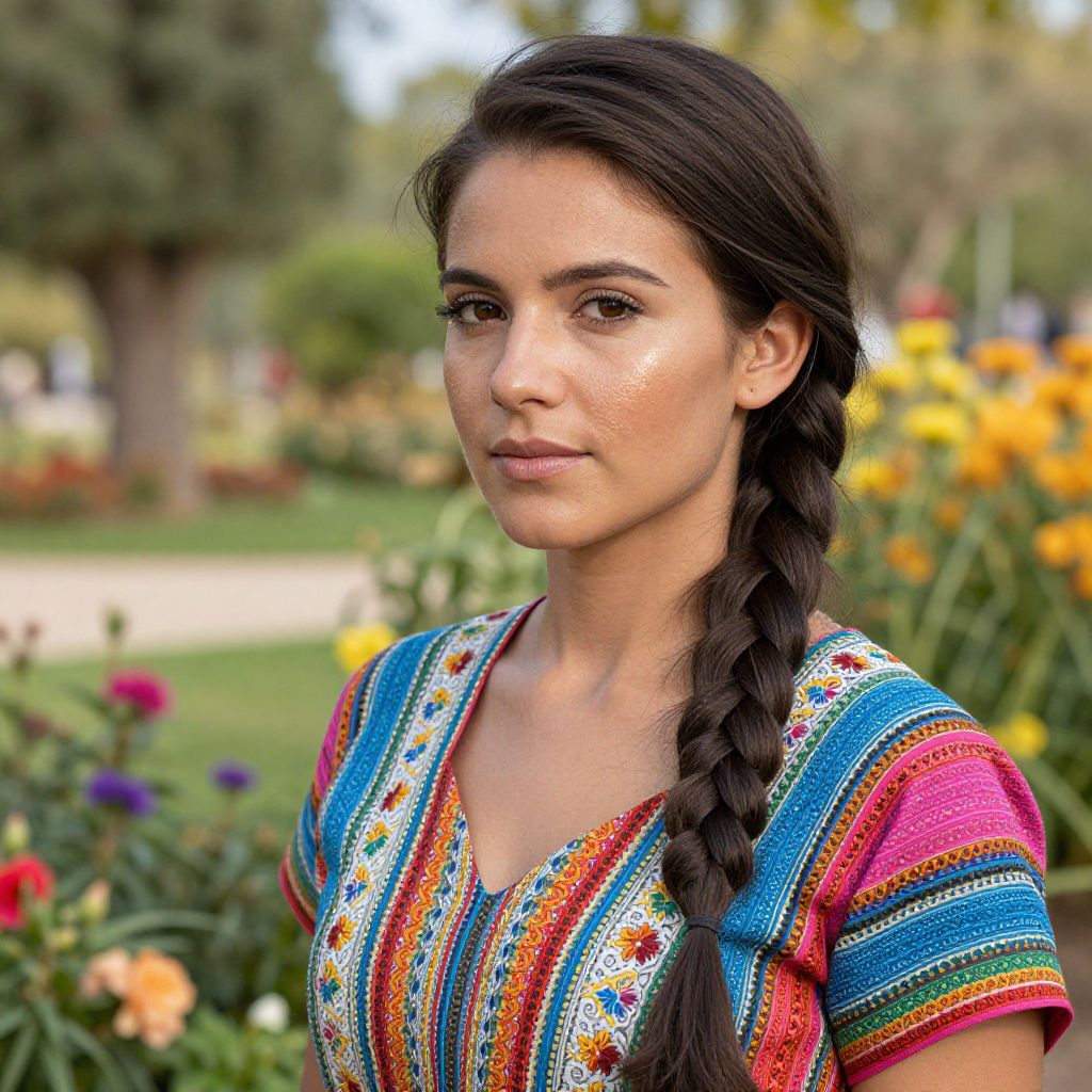 Red headed latina woman standing confidently in a vibrant urban street market, wearing traditional colorful clothing, warm sunlight casting dynamic shadows, expressive eyes, detailed textures in hair and fabric, realistic style with a touch of fantasy