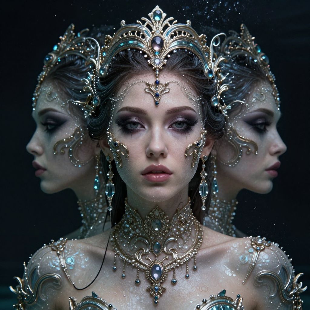 A hyper-realistic, intricately detailed woman made of water, with elaborate, ornate features and a double-exposure effect, set against a dark background.
