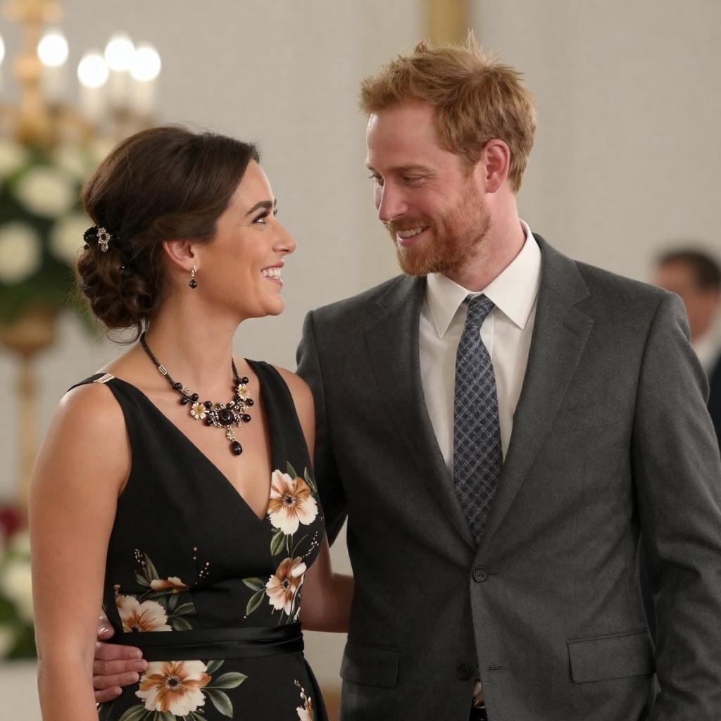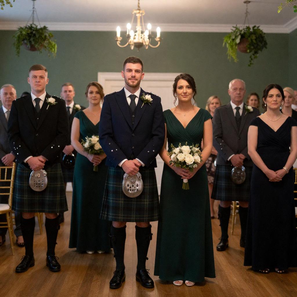 Photograph of a social gathering. Two women in formal dresses, one with dark hair and short bob, holding a glass of wine, smiling at the other woman with brown hair, tiara, and strapless green dress. Older man with beard in kilt stands in background, smiling. Greenery and string lights hang above.