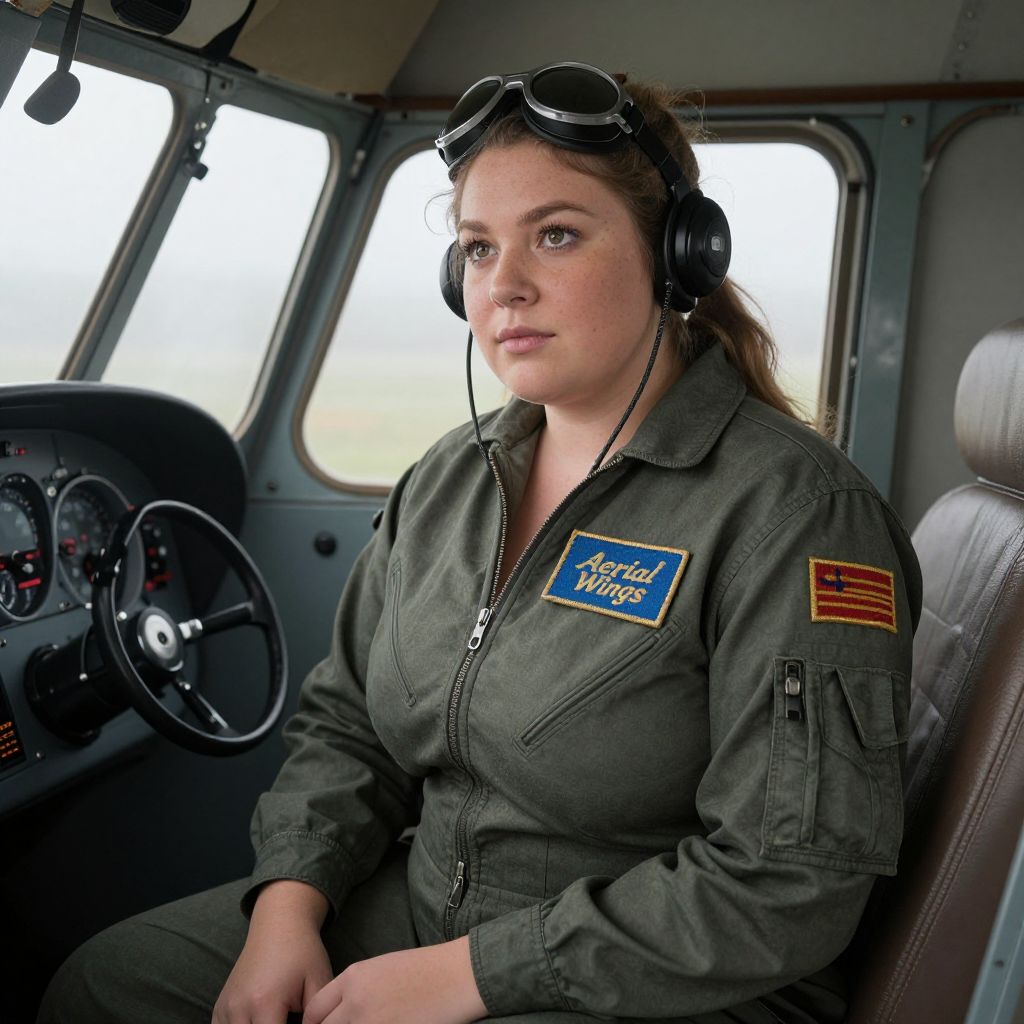 A realistic candid-style photograph of a plus-size woman in a full pilot costume, sitting in a retro-style cockpit with vintage airplane controls, wearing a flight suit with a large embroidered patch that says 'Aerial Wings'; she has light brown skin, a thoughtful expression, and natural facial features with a soft freckle pattern; the background shows foggy morning light filtering through the windows of a small hangar.. The woman has big breasts and cute face