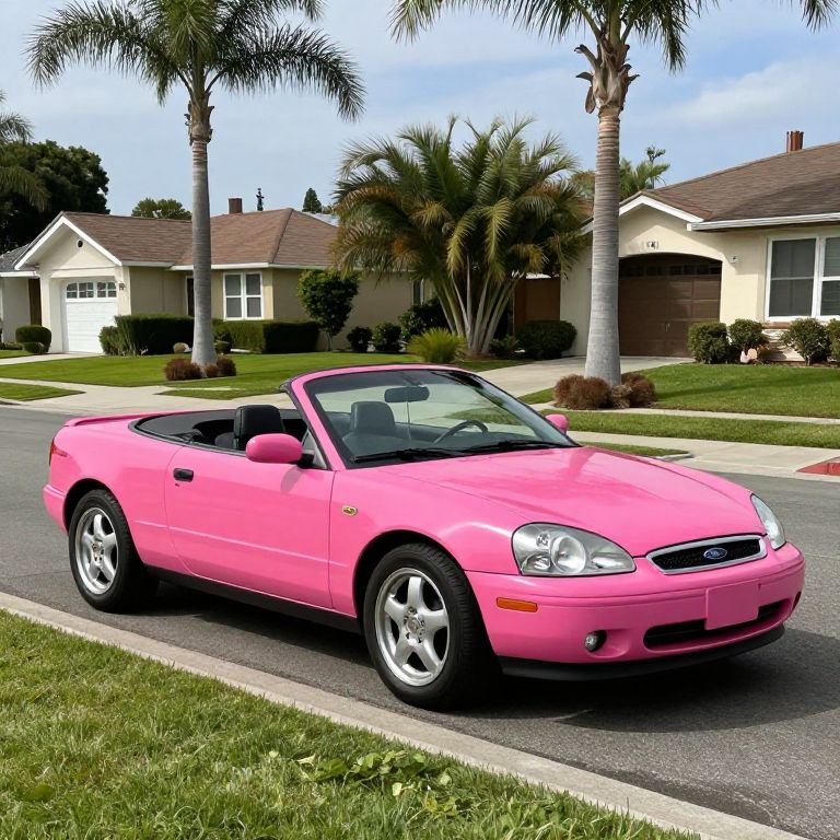 Vibrant pink 2004 Ford StreetKa Luxury Thunderbird convertible parked gracefully along a suburban street, showcasing its sleek design and limited edition appeal amidst palm trees and neatly landscaped homes.