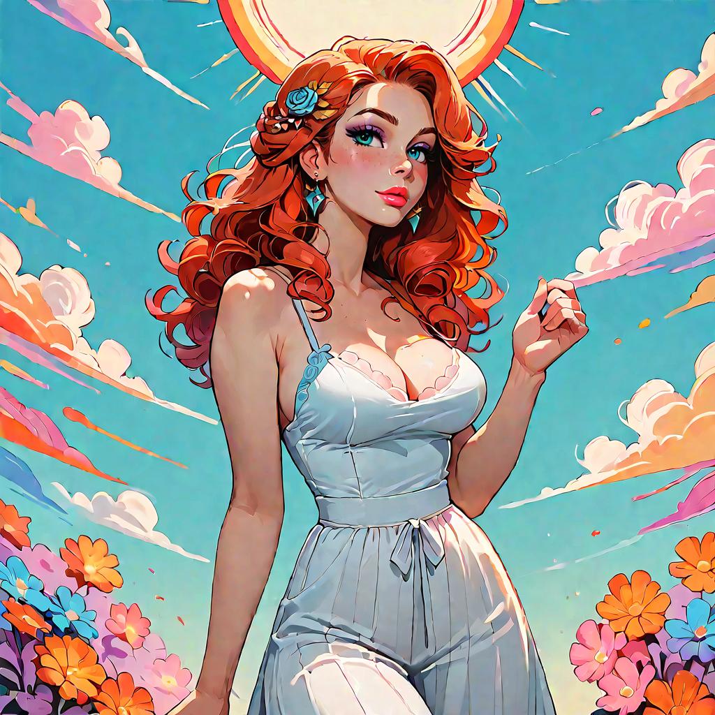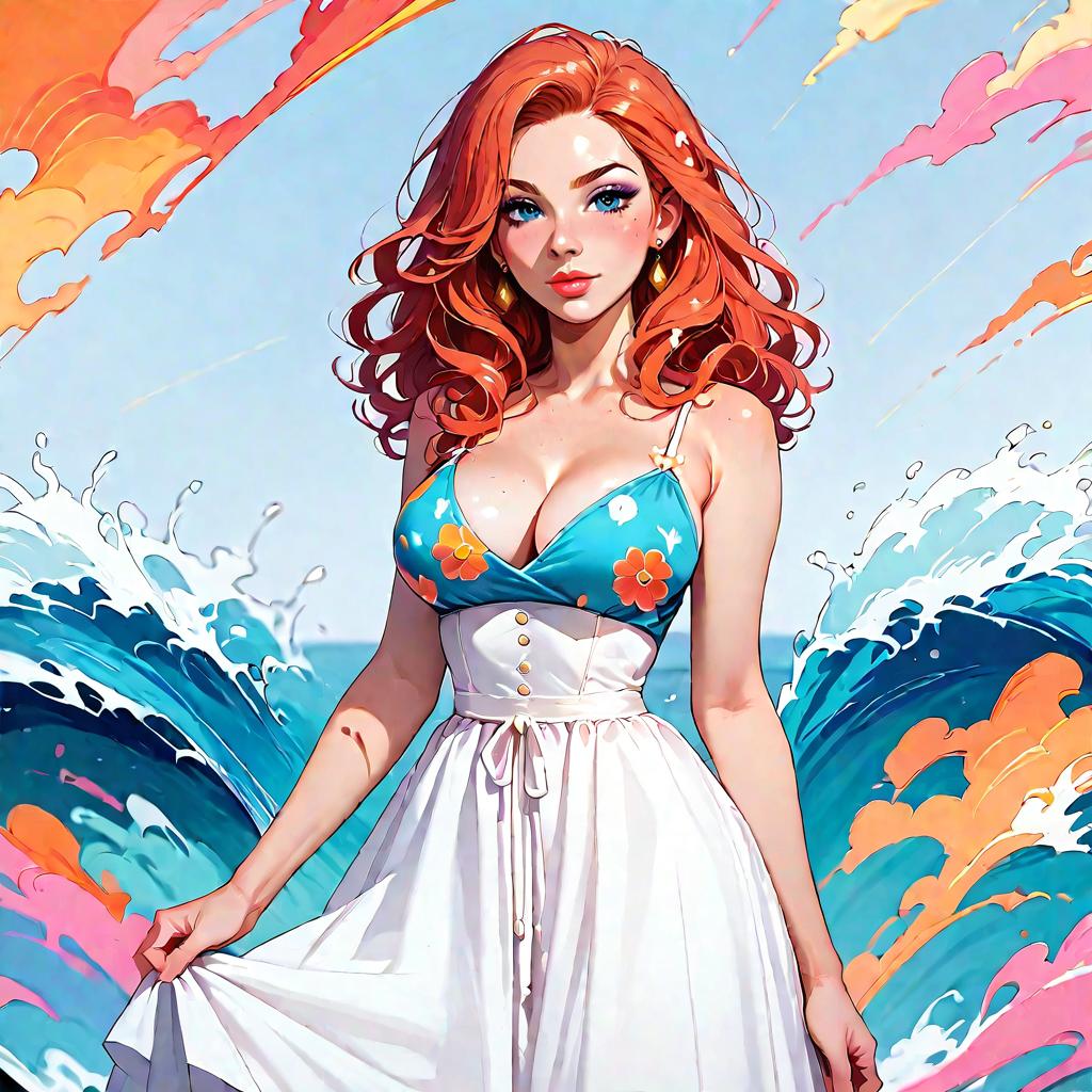 Digital illustration of a young woman with short curly brown hair adorned with flowers, wearing a vibrant blue and white midi sundress decorated with pink and orange floral prints. The woman has fair skin with freckles and wears blue earrings. The dress features ruffled short sleeves, a deep neckline, and a belt tied at the waist. The background includes flowing pastel-colored abstract waves against a light sky.