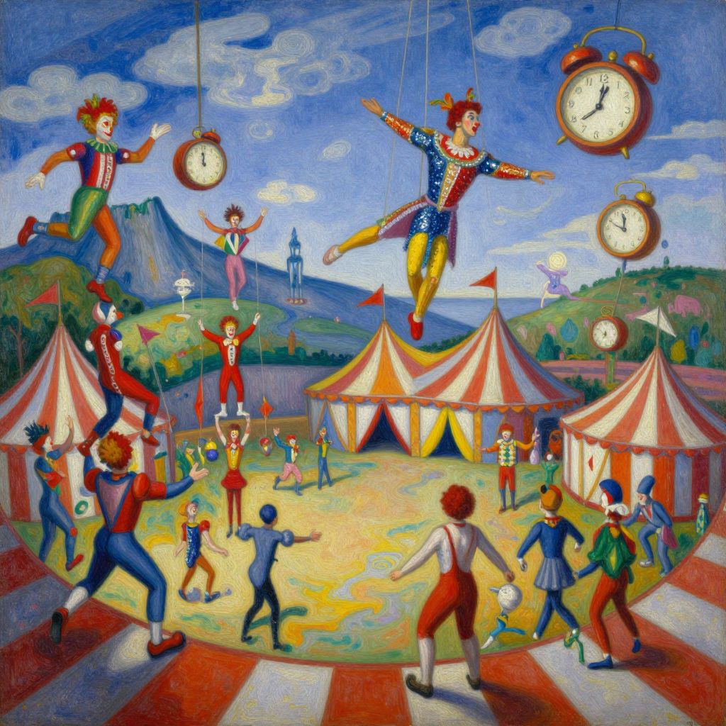 Vibrant painting of acrobatic clowns, clock pendulums, and circus tents under a blue sky with mountains, surrounded by children in