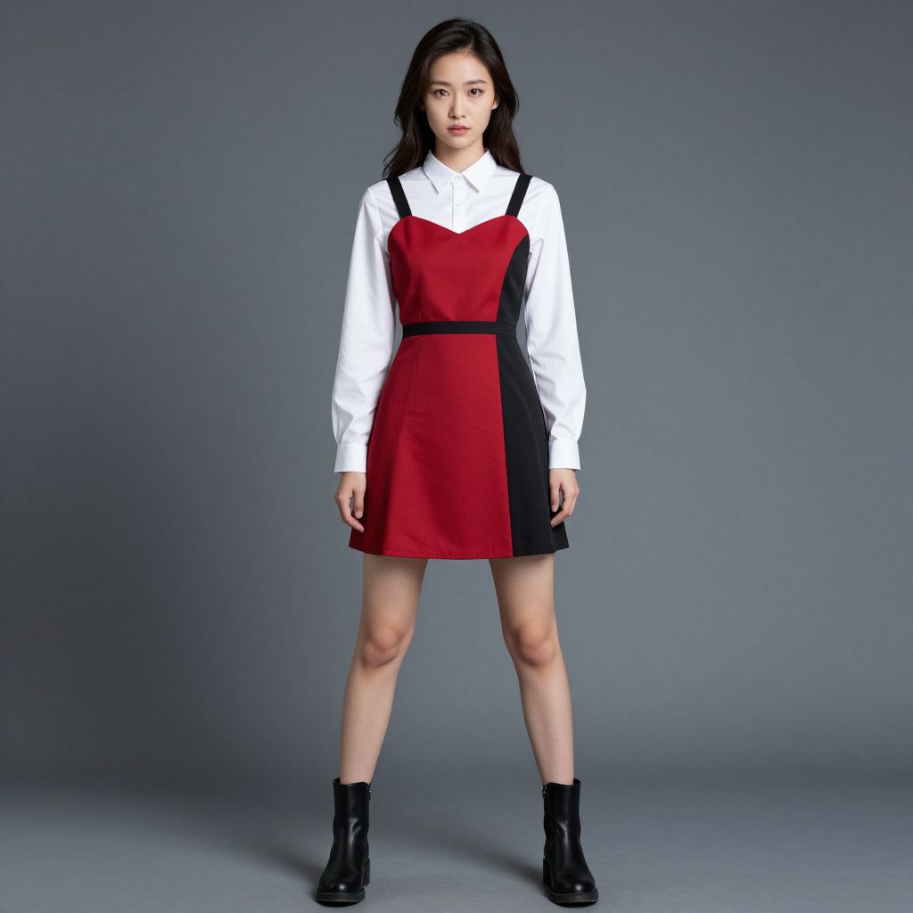 Photograph of an Asian woman standing against a gray studio backdrop. She has medium-length, wavy black hair and a neutral expression. She wears a white, long-sleeved button-up shirt paired with a red and black dress that has a red top section and black sides. The dress has a black waistband and black straps. She completes the outfit with black ankle boots. The lighting is even, highlighting her outfit and expression. The overall style is modern and minimalist.